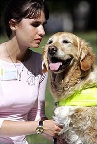 When Nicola Cockburn was partnered with her new guide dog In honour of the guide dogs names she will walk the 200 miles from the ground of Port Vale FC to Chelsea FC’s stadium. Nicola, 29, and Chelsea, a black Labrador, hope to meet some of the star players from the two football teams at the beginning and end of their marathon walk. They want to raise as much money as they can to donate to Guide Dogs, to help provide other visually impaired people with the life changing freedom and independence that a guide dog brings. Nicola has been with her second guide dog Chelsea - who will accompany her for sections of the walk - for nine months. To train for the walk, Nicola is now a regular in the gym and can be seen on training walks around the local area. She will soon step up her training by walking in the local mountains to get used to the rough terrain. One of the main reasons for this walk is Vale, Nicola’s previous guide dog, who was her loyal companion for over 9 years until she was retired last year due to old age, but now lives with Nicola and Chelsea. The Golden Retriever was extra special to Nicola as she was awarded the title of Exceptional Work Guide Dog of the Year 2005, after helping Nicola to lead a more independent and varied life. Vale helped Nicola to attend university as well as be able to tour the country with a theatre company. This meant a set of new routes for Vale to learn but she took it in her stride and successfully guided Nicola everywhere they needed to go. At the time, Nicola commented: “Vale is amazing; whenever we travel away from home she copes extremely well with any changes and is always willing to adapt to the new environment. Once we come home she remembers all of our old routes, including back to college when we haven’t been for many months – she’s amazing”. Rod Arthern from Guide Dogs fundraising commented: ”We wish Nicola and Chelsea luck for their walk and hope that they reach their fundraising targets. They are certainly putting in lots of hard work with their training and are really looking forward to their two week trek! “It costs £10 per day to breed, train and support each of the 4,600 guide dog partnerships in the UK and as we receive no Government funding, every penny that Nicola raises will help to make a big difference to the lives of visually impaired people in the UK”. For more information about this amazing task, go to Nicola's website at www.valetochelsea.co.uk September 10, 2007 |