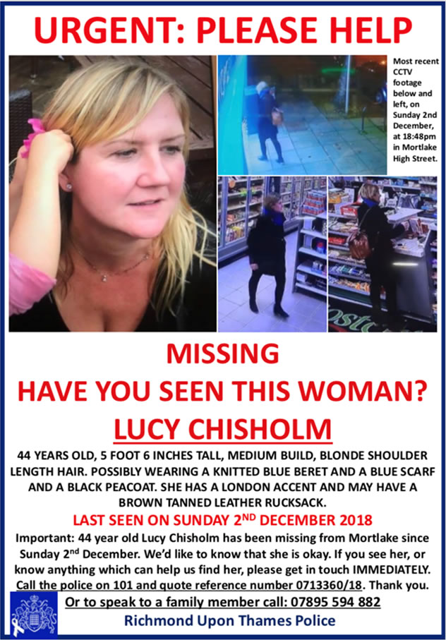 The family and friends of 44-year-old Lucy Chisholm are becoming increasingly concerned for her after she has not been heard from for over two weeks. Lucy, 44, was last seen on CCTV footage in a shop on Mortlake High Street on the evening of Sunday, 2 December. She was wearing a blue scarf and black peacoat and a brown leather backpack. Since then she has not used her bank cards or her phone.